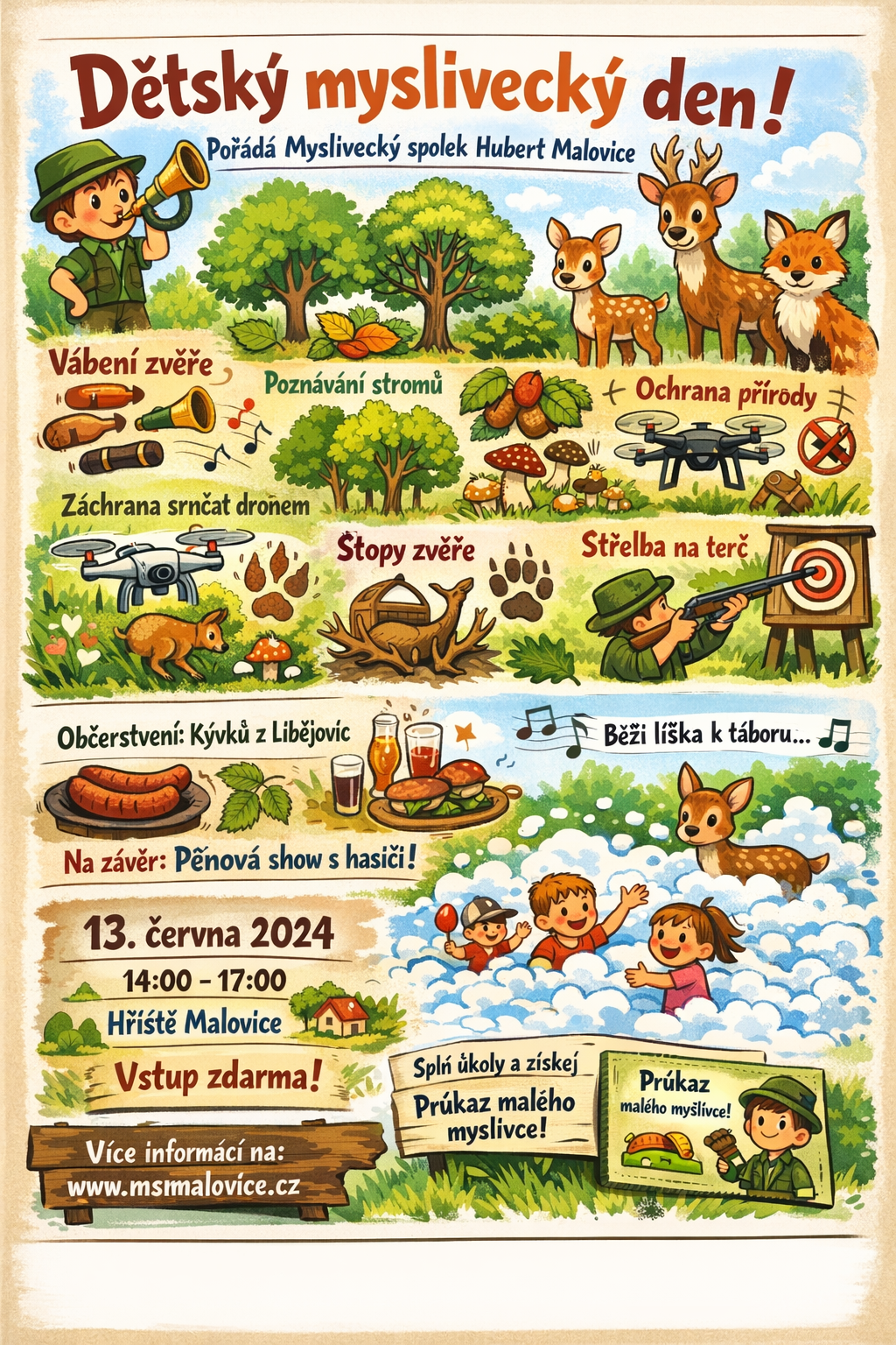 Myslivecký spolek Hubert Malovice srdečně zve všechny děti, rodiče, prarodiče i širokou veřejnost na Dětský myslivecký den – jedinečné odpoledne plné zábavy, her a poznávání přírody, myslivosti a tradičních hodnot venkova. Cílem akce je hravou a srozumitelnou formou přiblížit dětem přírodu, les, zvěř a práci myslivců, naučit je základům správného chování v přírodě a zároveň nabídnout příjemné společné odpoledne pro celé rodiny.